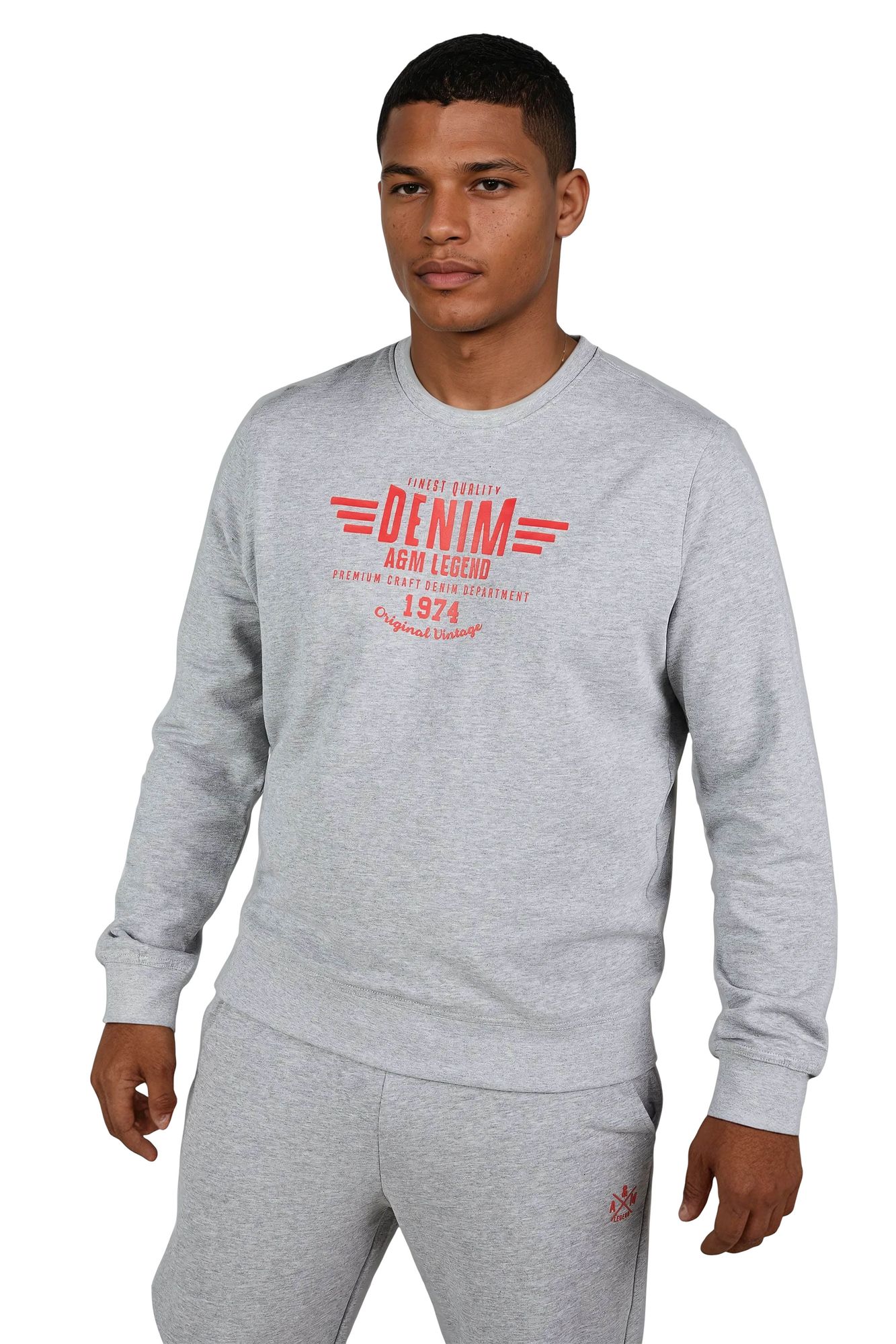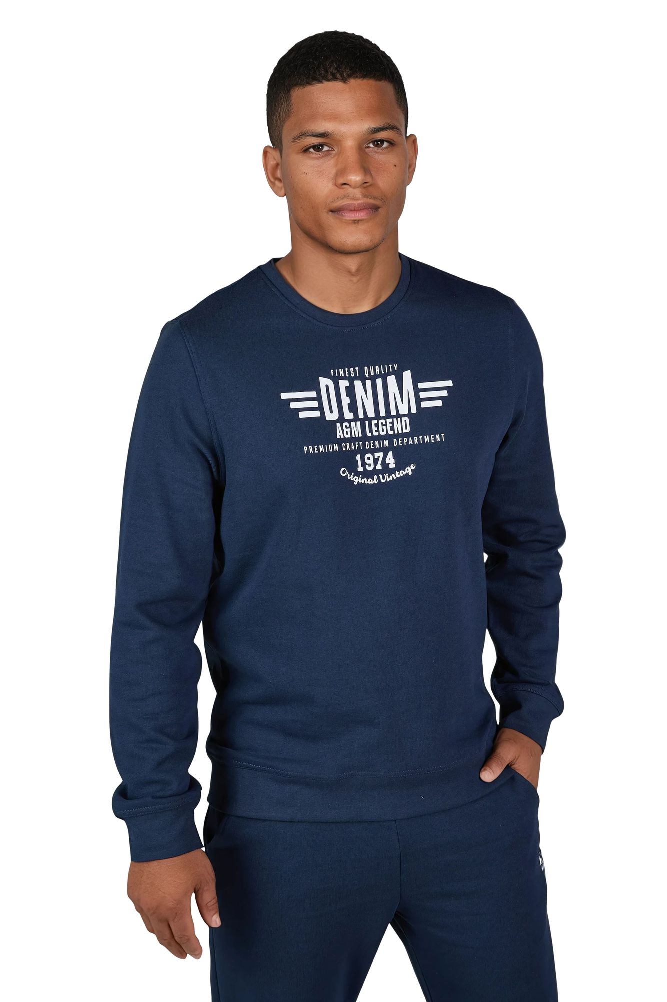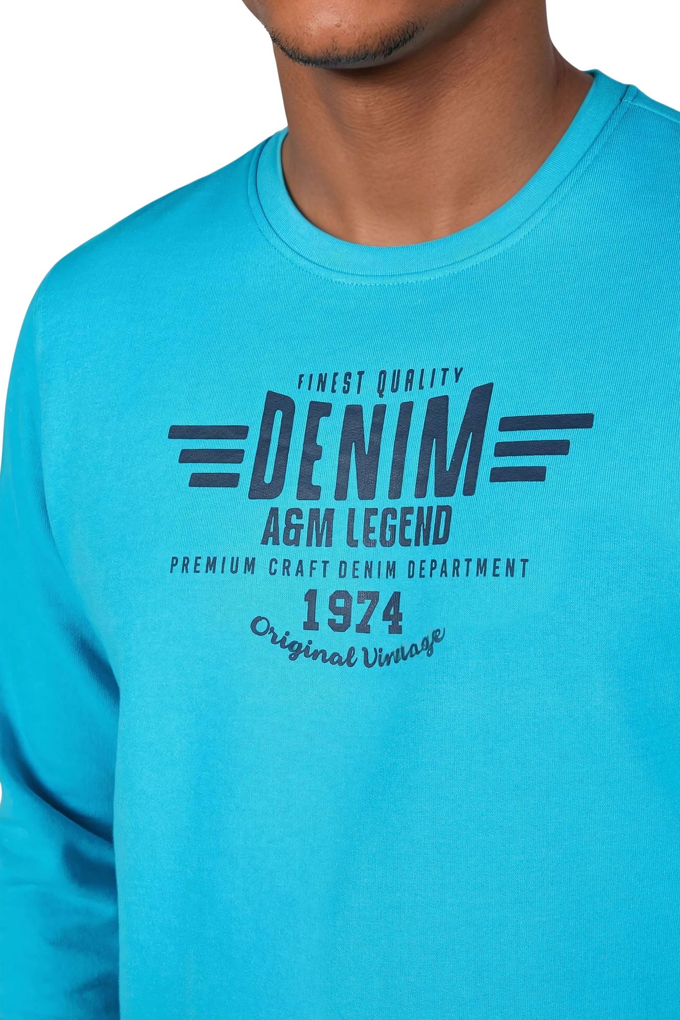 Das Design wird durch den markanten Frontprint „Denim A&M Legend – Original Vintage 1974“ abgerundet. Der Pullover besteht aus einer hochwertigen Baumwoll-Polyester-Mischung (60 % Baumwolle, 40 % Polyester) mit 260 GSM gebürsteter Innenseite, die angenehm weich auf der Haut liegt und Wärme spendet.