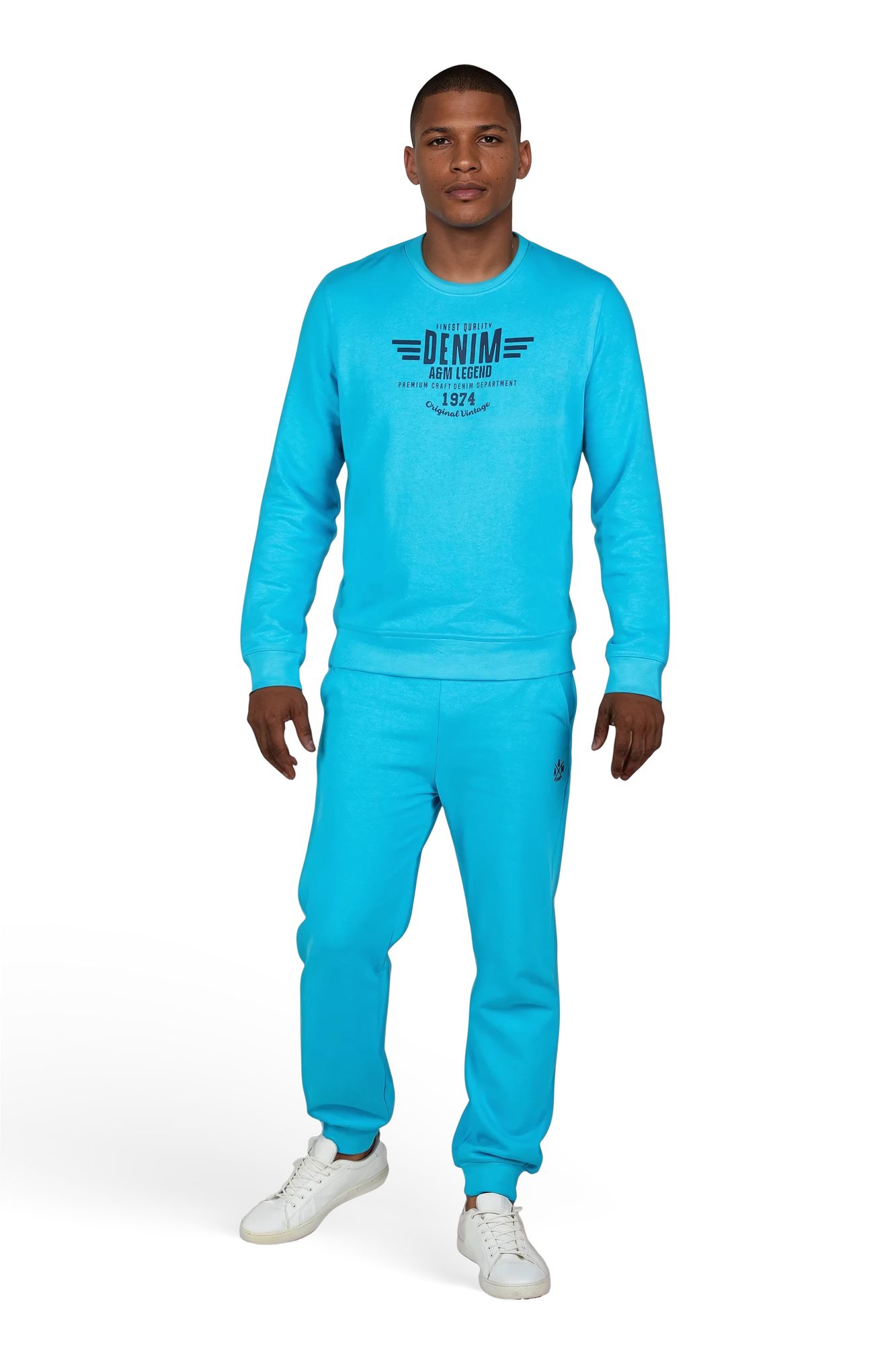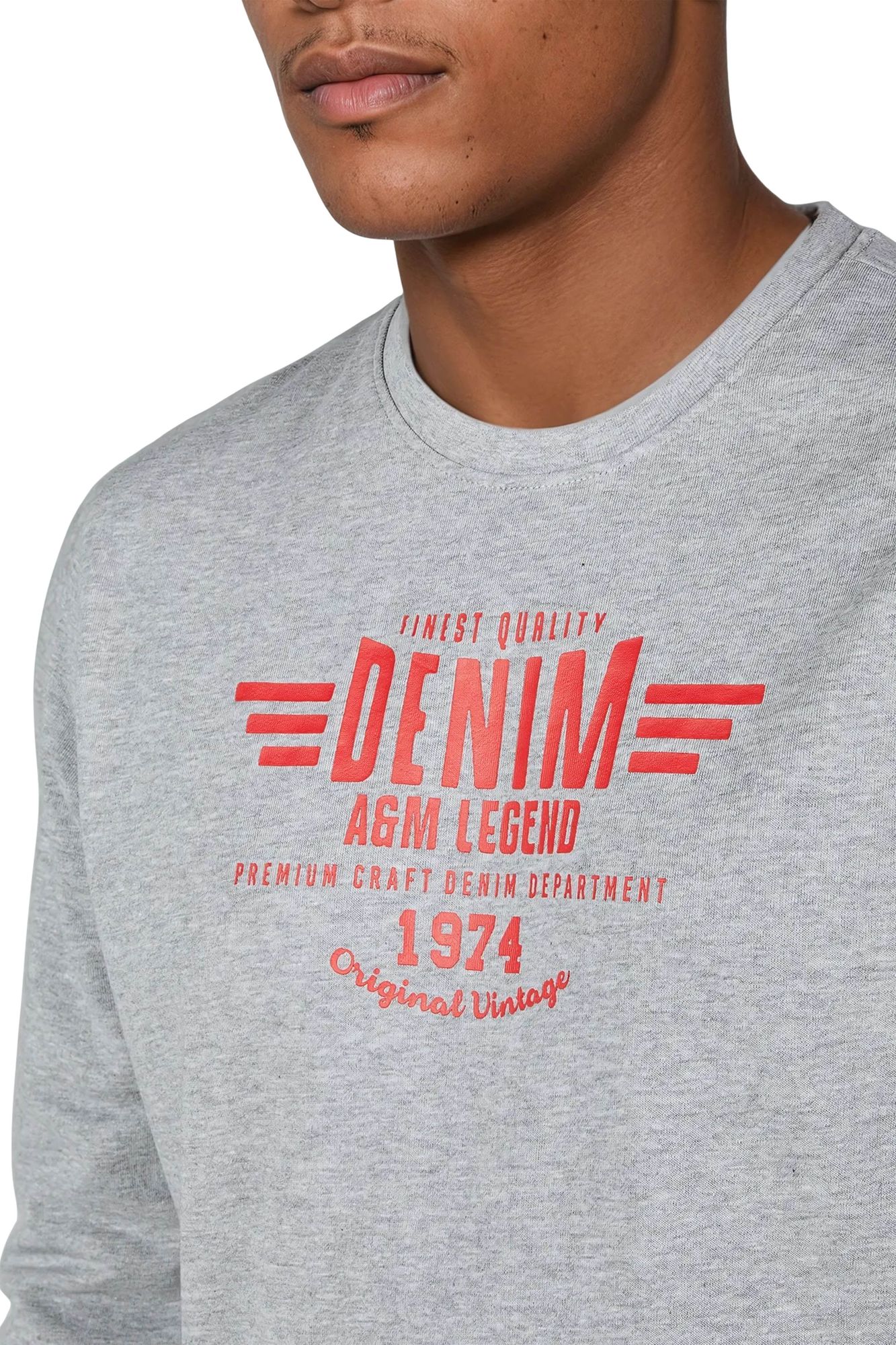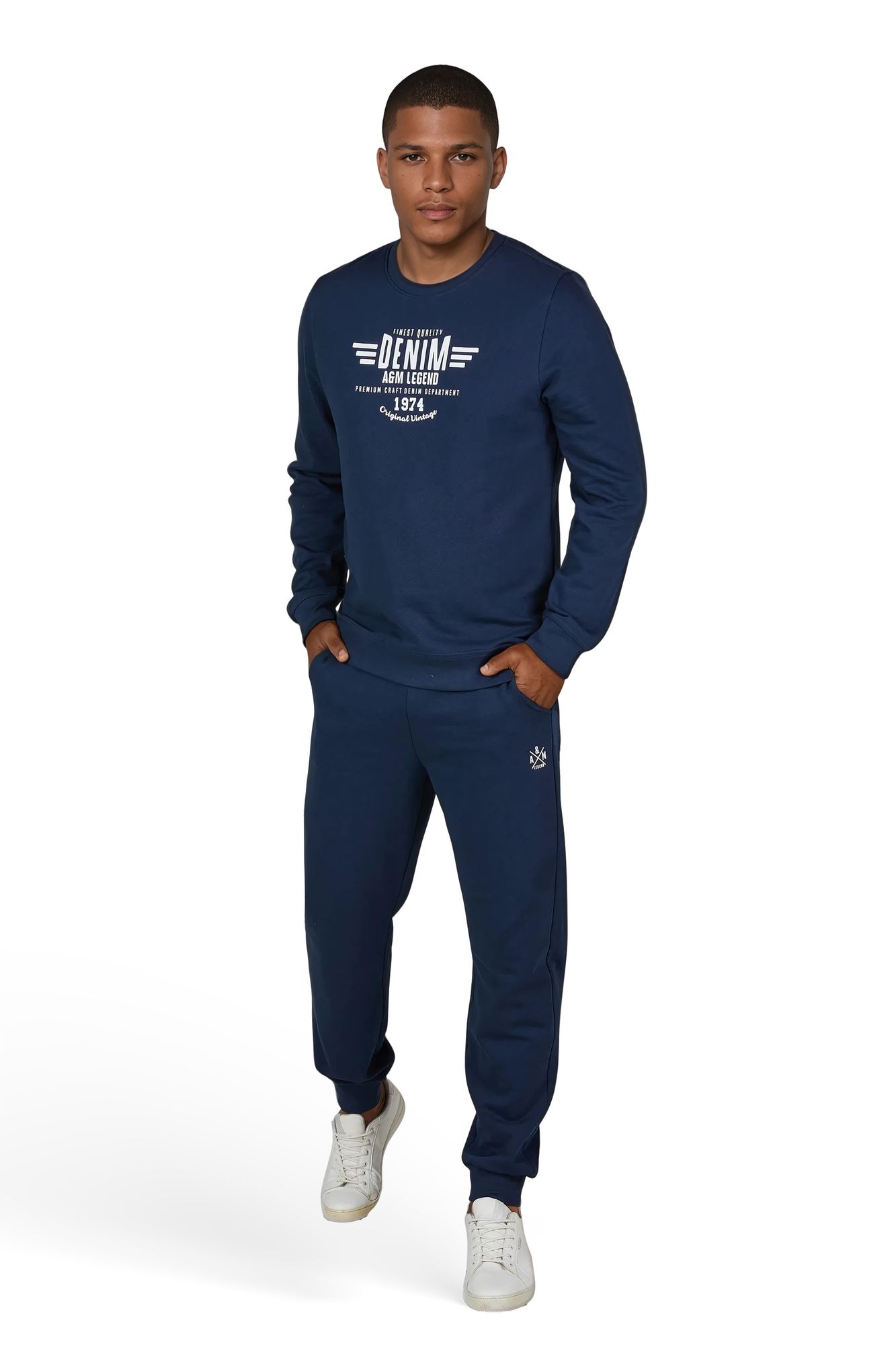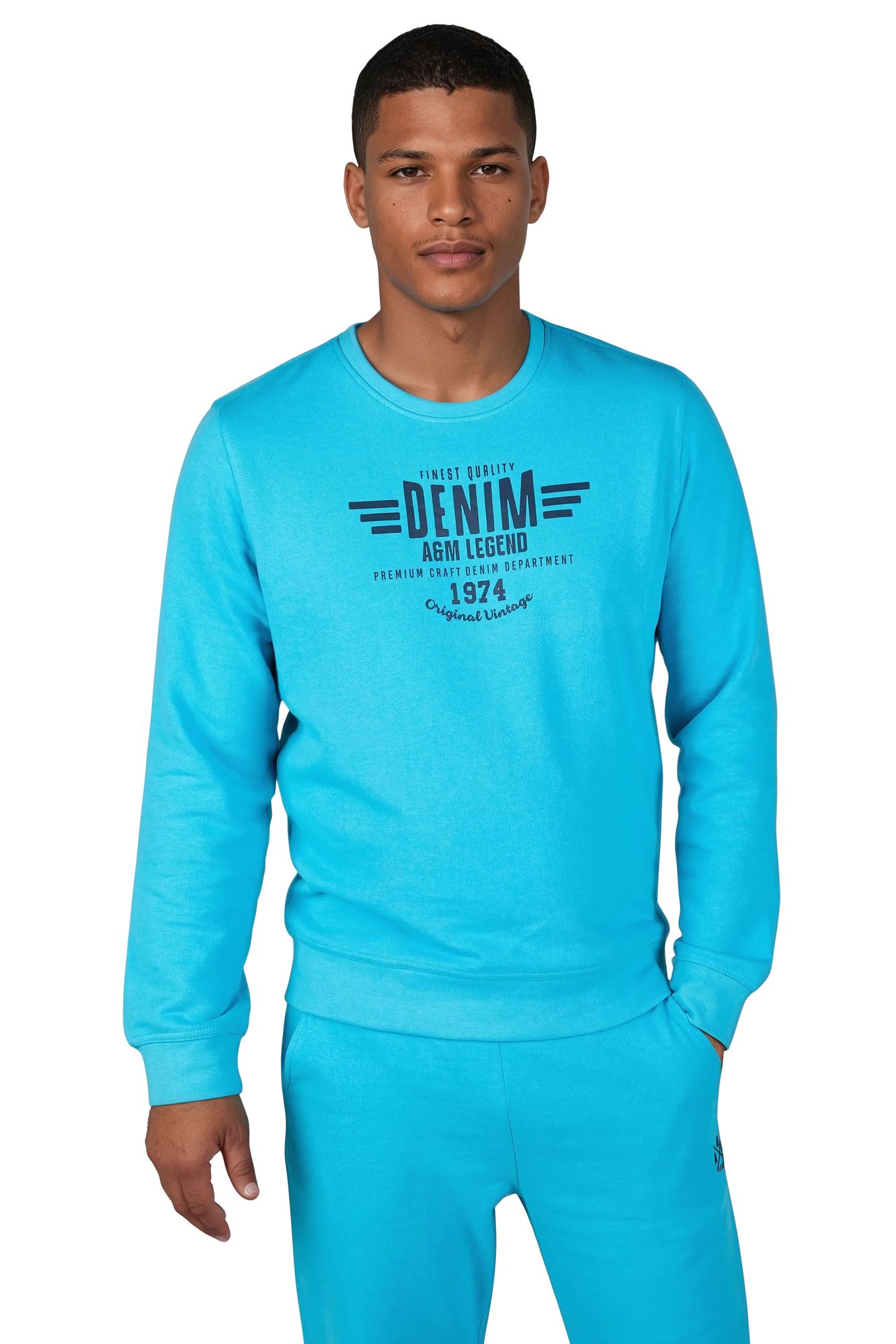 Das Design wird durch den markanten Frontprint „Denim A&M Legend – Original Vintage 1974“ abgerundet. Der Pullover besteht aus einer hochwertigen Baumwoll-Polyester-Mischung (60 % Baumwolle, 40 % Polyester) mit 260 GSM gebürsteter Innenseite, die angenehm weich auf der Haut liegt und Wärme spendet.